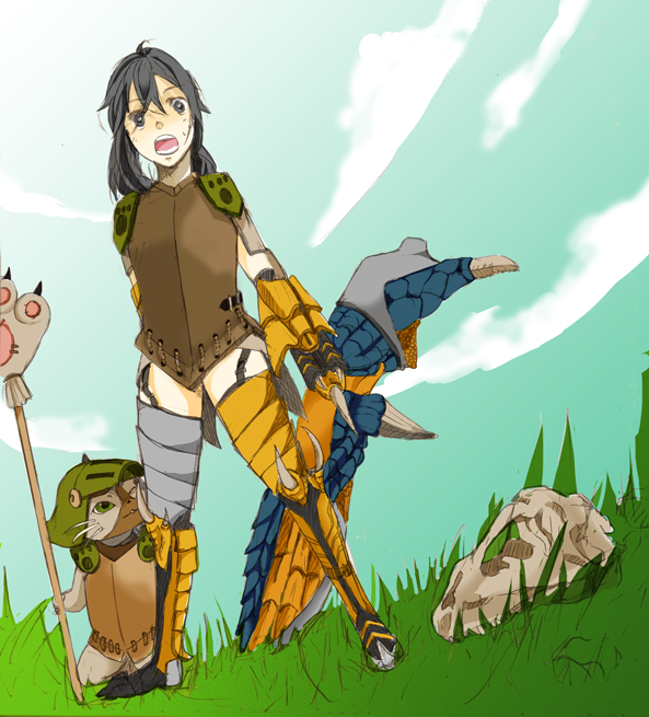 アイルーとお揃いにしようと思って上半身だけドングリメイルにしたけど両方ごつめの武器でもよかったんじゃないかなぁていう……すごく奇妙…。おっきい大剣引きずってたらかわいいと思います。何使っててもかわいいと思います。